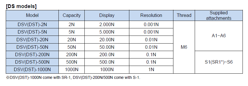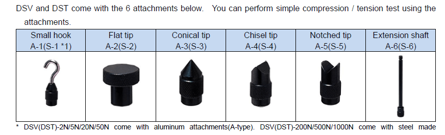 - Range from 2N-1000N types and able to toggle between N/kgf/lbf units. Comes with 6 accessories to perform various pull and push functions. If the supplied attachments does not fit your sample or testing requirements, there are a range of optional accessories which can also be purchased.