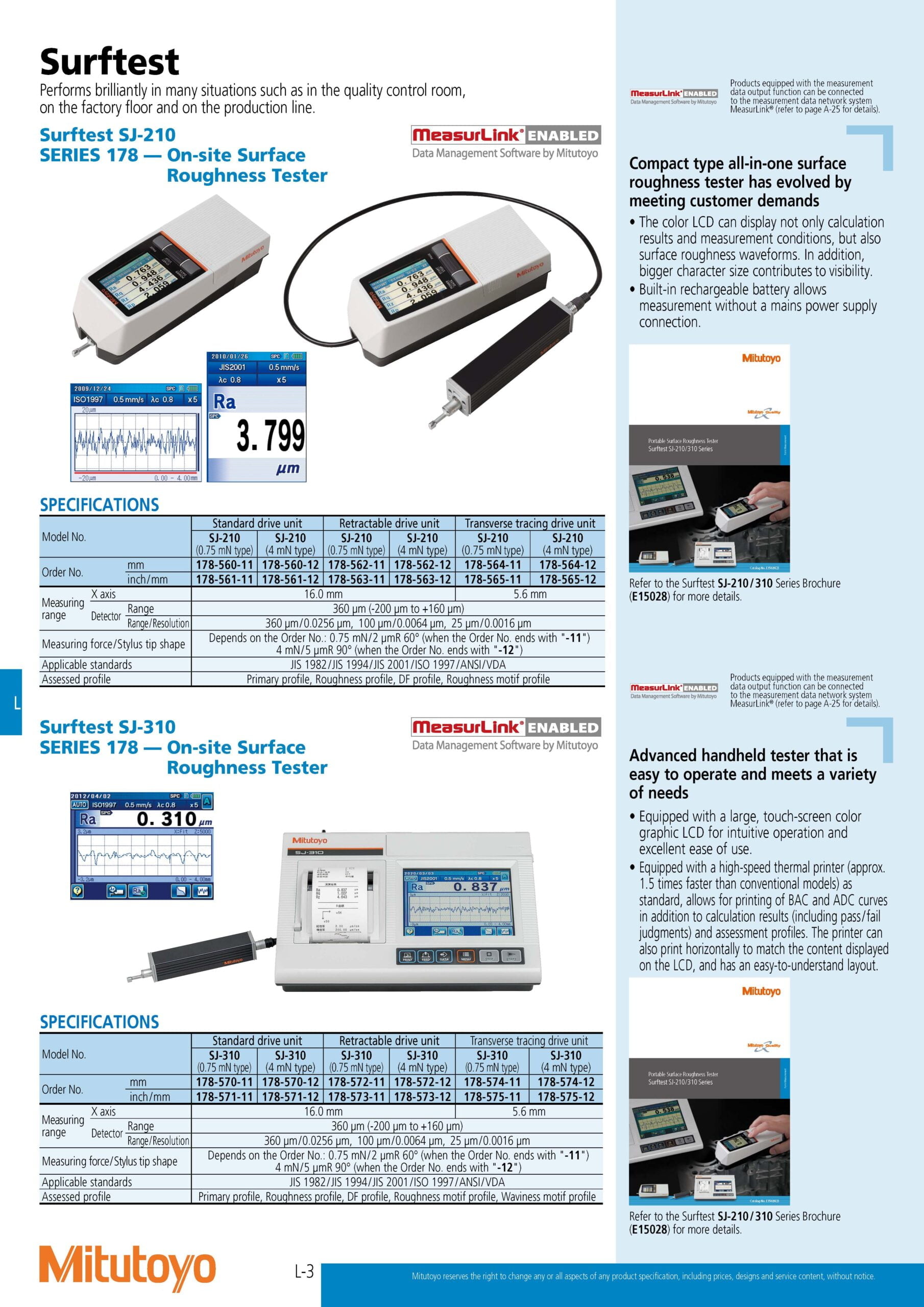 Mitutoyo SJ210 Surftest. Compact all-in-one surface roughness tester that performs brilliantly in many situations such as the quality control room, factory floor and production line. The industry standard for roughness testing.